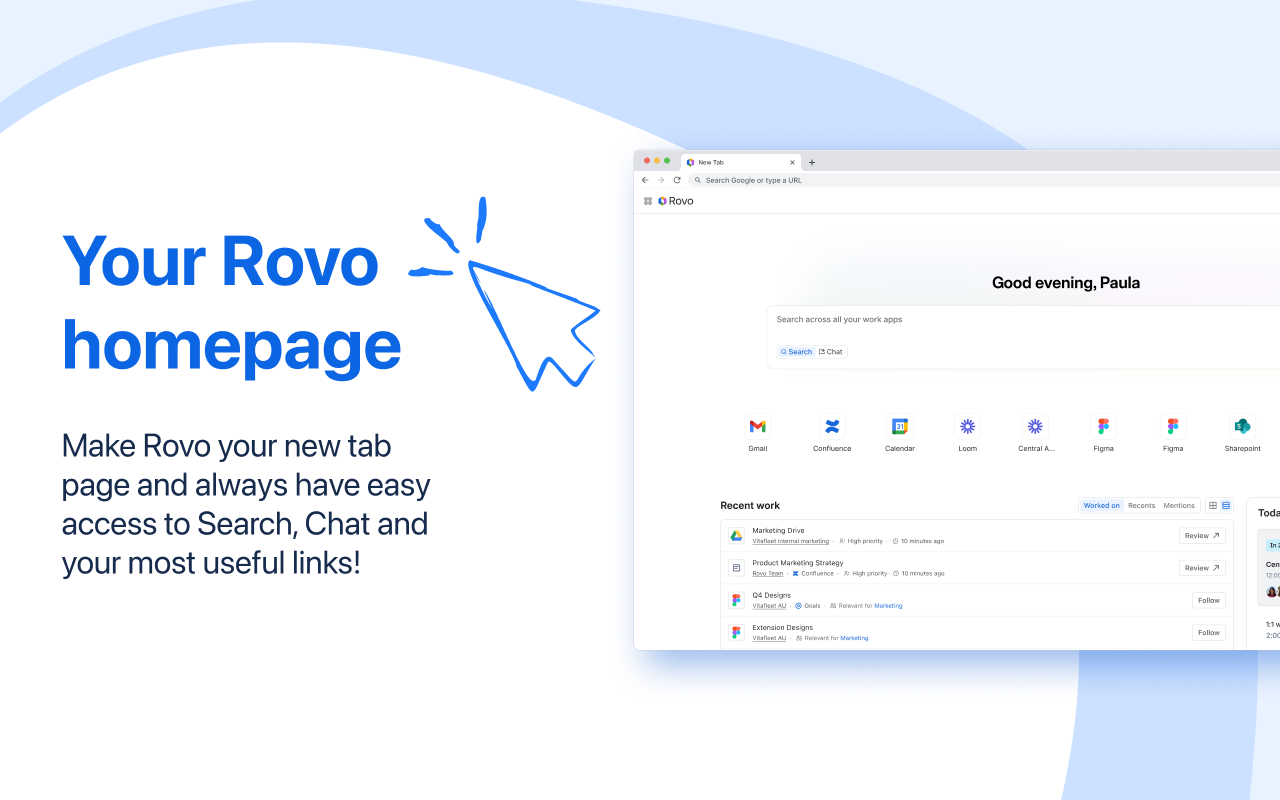 把 Rovo 设为新标签页后,能快速访问搜索、聊天,以及常用链接。方便在工作中快速检索信息、管理任务、发起协作聊天。