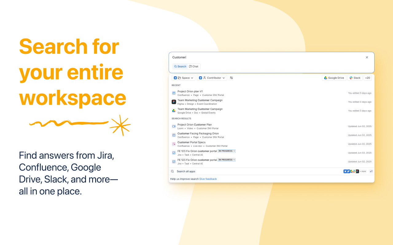 搜索整个工作空间的内容,包括 Jira(项目管理)、Confluence(知识库)、Google Drive(云文档)、Slack(聊天工具)等工具里的信息。