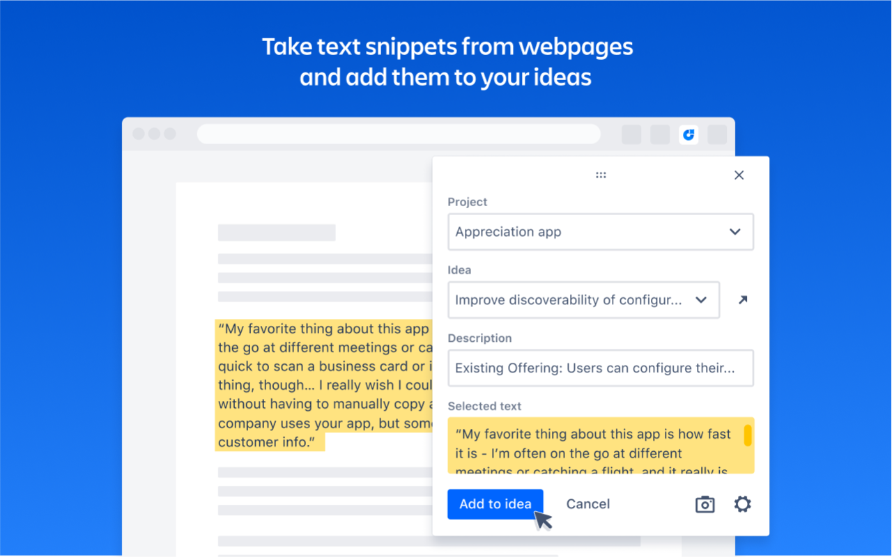 可直接把网页选中的文本片段快速添加到对应产品创意中,省却手动复制粘贴的步骤。
