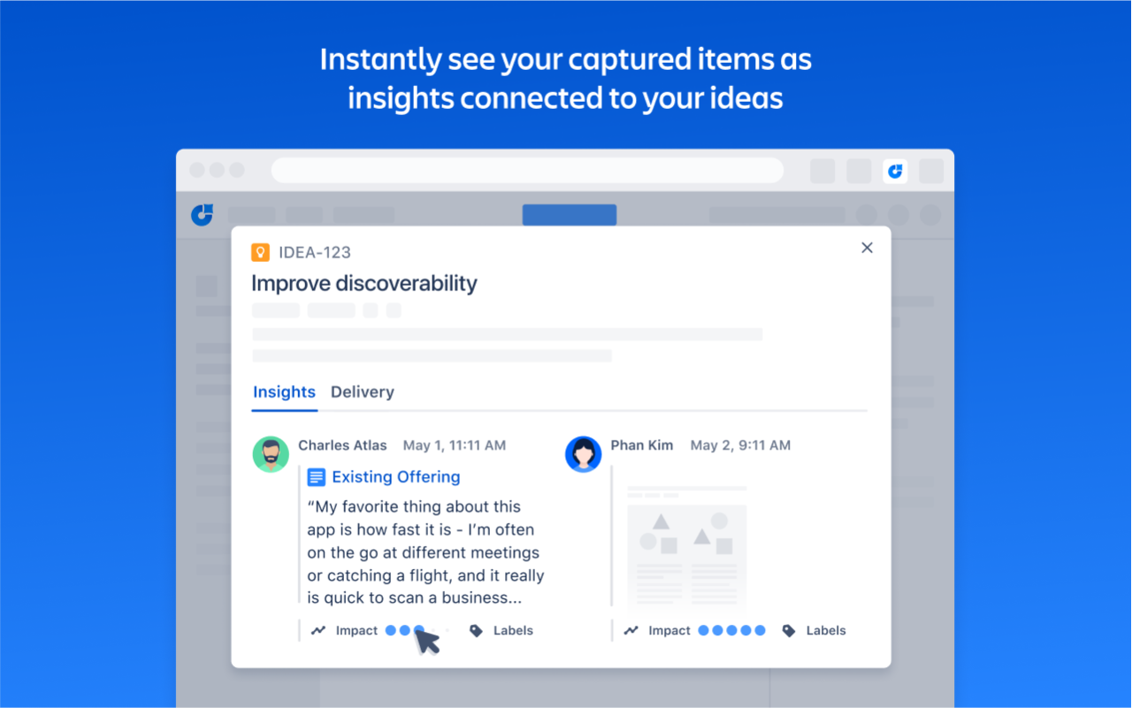 支持捕获的文本、截图等内容直接关联到对应产品创意中,即时以 “洞察” 形式展示。
