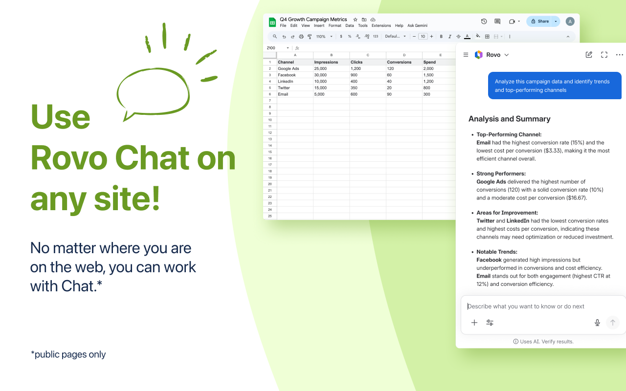 无论你在网页的哪个位置(比如当前打开的表格页面),都能直接调用 Rovo Chat。 它可以基于当前页面的内容帮你做分析、总结等工作。