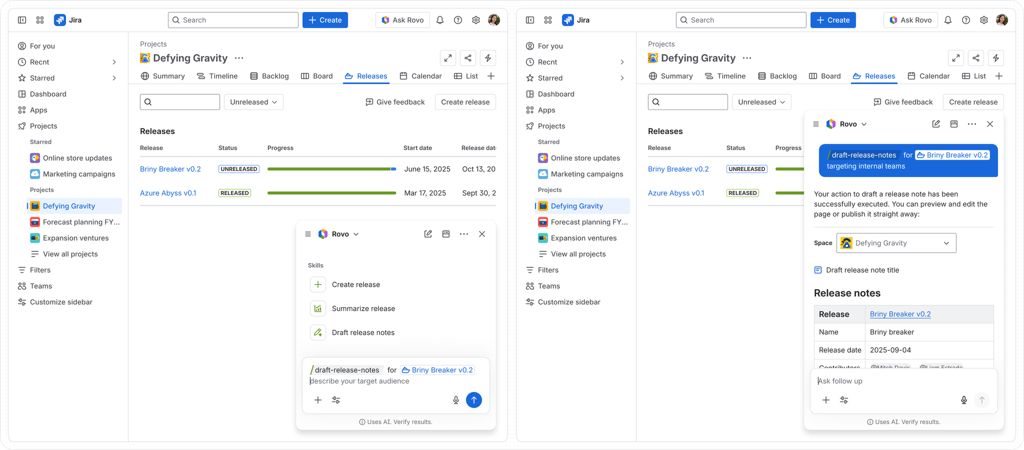 对于某些 Skills ,你无需记住具体的斜杠命令。你只需用自己的话询问 Rovo,它就会在后台找到相关 Skills  并执行。